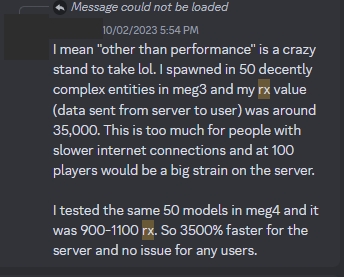✅ MEG v3 has lower packet usage (-30%) for moving entities compared to IA. ❌ MEG v3 has higher packet usage (+20%) for standing entities compared to IA. ❌ MEG v3 entity walking/rotating looks clunky as you can see in the previous video.