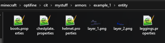 Now save the previously created on-body textures (layer_1.png and layer_2.png ) inside this folder: contents/mystuff/resourcepack/minecraft/optifine/cit/mystuff/armors/example_1/entity/