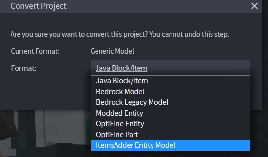 Select "ItemsAdder Entity Model" in the Format setting, then press Confirm. Now save the new converted model file in a new folder where you will put only this file.